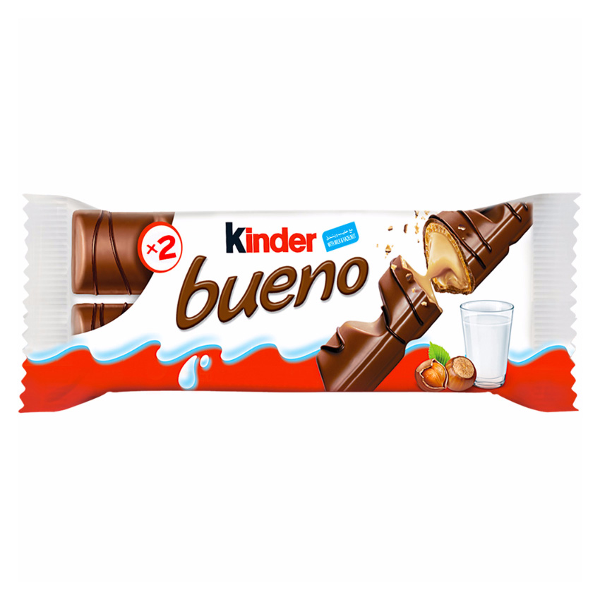 Το Kinder Bueno είναι το σοκολατένιο σνακ με την ανάλαφρη και λαχταριστή γεύση. Τραγανή κι ελαφριά γκοφρέτα με γάλα και φουντούκια. Απόλαυσε την ακαταμάχητη γεύση του Kinder Bueno με σοκολάτα γάλακτος!